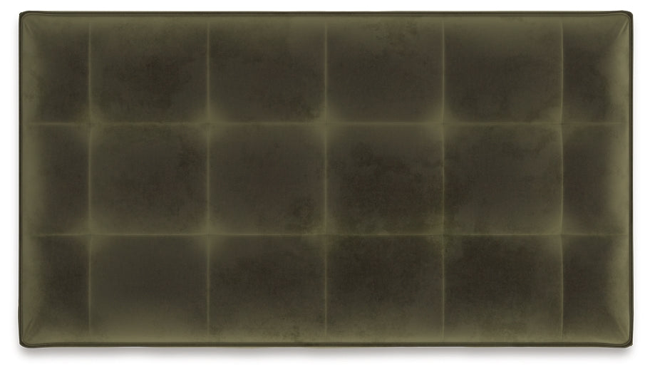 This sleek oversized accent ottoman offers a highly contemporary look with plenty of space to spread out. Dramatic tufted detailing and luxurious upholstery in a rich olive color create a sophisticated atmosphere. This ottoman is perfect for those who love to entertain, or simply relax, in uptown style and comfort.