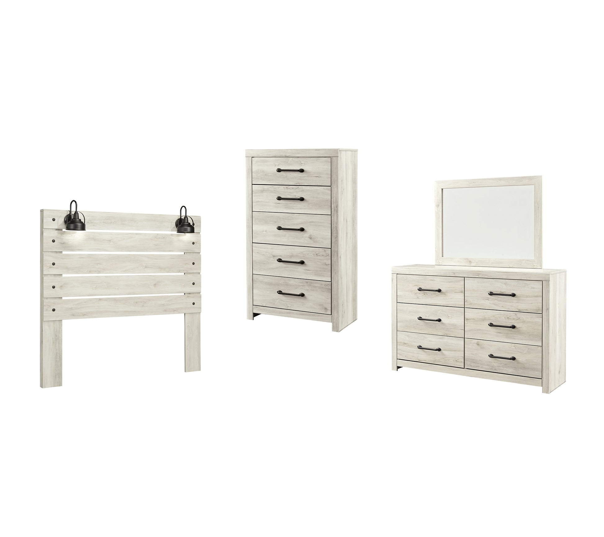 | Details | B192-57: Made of engineered wood (MDF/particleboard) and decorative laminate, Wispy white finish over replicated oak grain with authentic touch, 2 decorative sconce lights, LED with 3 AA batteries, 2 slim-profile USB charging stations, Power cord included; UL Listed, Hardware not included, ¼" bolts are needed to attach headboard to existing bed frame, Bolt length depends on thickness of your bed frame, Assembly required, B192-46: Made of engineered wood (MDF/particleboard) and decorative laminate, Wispy white finish over replicated oak grain with authentic touch, Large-scale hardware with dark finish, 5 smooth-gliding drawers, Drawer interiors are lined with a faux linen laminate for a clean, finished look, Safety is a top priority, clothing storage units are designed to meet the most current standard for stability, ASTM F 2057 (ASTM International), Drawers extend out to accommodate maximum access to drawer interior while maintaining safety, B192B1: Includes dresser with mirror, Made of engineered wood (MDF/particleboard) and decorative laminate, Wispy white finish over replicated oak grain with authentic touch, 6 smooth-gliding drawers, Drawer interiors are lined with a faux linen laminate for a clean, finished look, Large-scale hardware with dark finish, Mirror attaches to back of dresser, Assembly required, | |