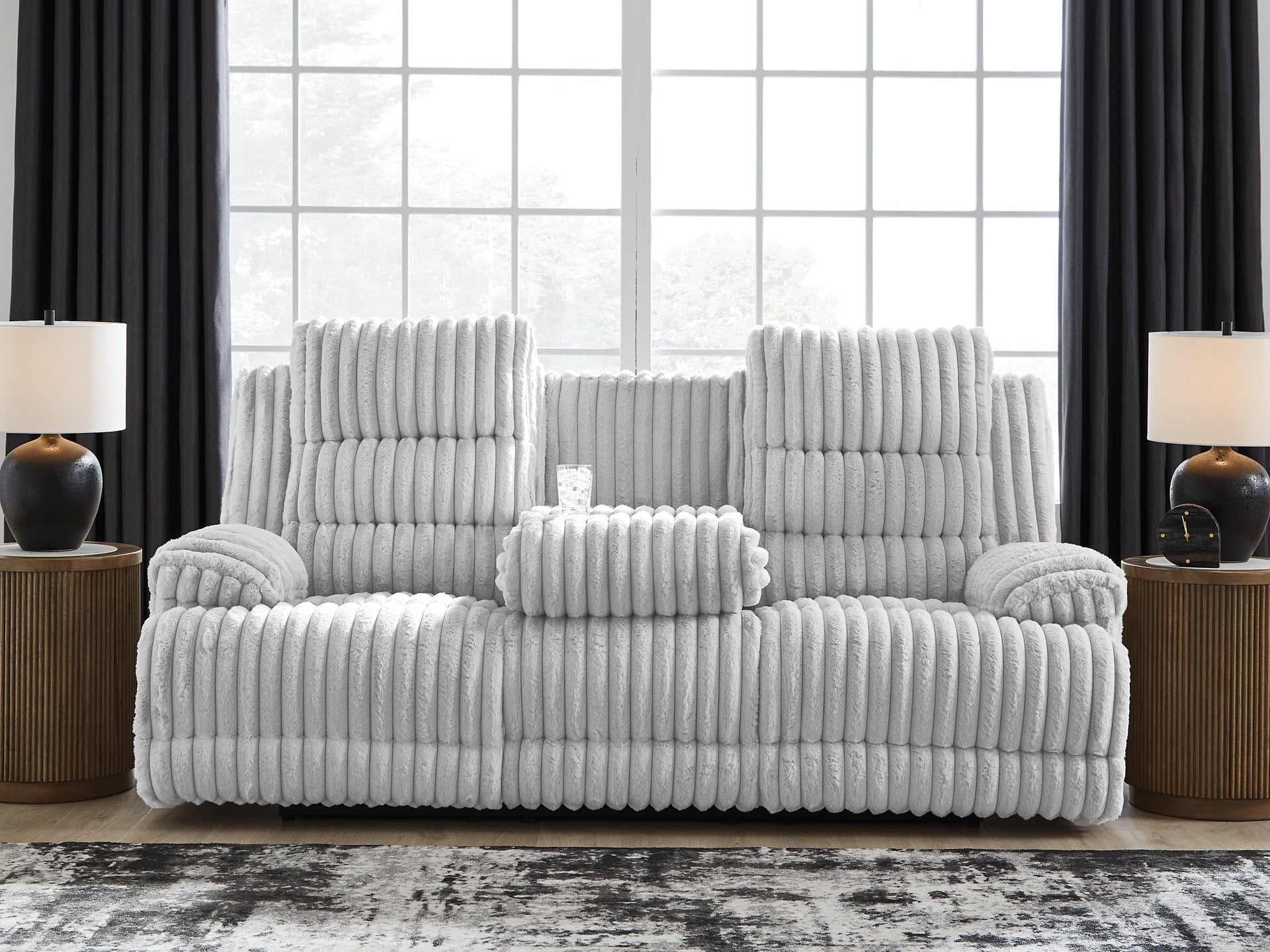 | Details | Dual-sided recliner; middle seat remains stationary, One-touch power control with adjustable positions, Steel to the floor construction; steel seat box; steel floor rails, Heavy gauge sinuous springs, Reinforced floor glides, 48” back height, Reclining mechanism rates for 400 lbs., Attached cushions, High-quality foam cushions wrapped in poly fiber, Polyester upholstery, Drop-down table, Power cord included; UL Listed | |