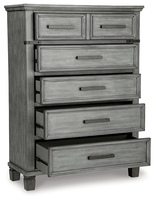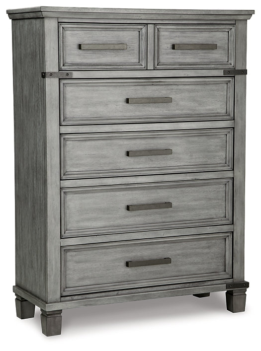 What's old is what's new with this chest. Serving up a fresh look in urban farmhouse style, the eclectic piece features a light weathered gray finish with dark aged bronze-tone bar pulls and metal straps for a casually cool sensibility. Profiled drawer frames, thick-profiled top moulding and tapered legs are the earmarks of timeless design.