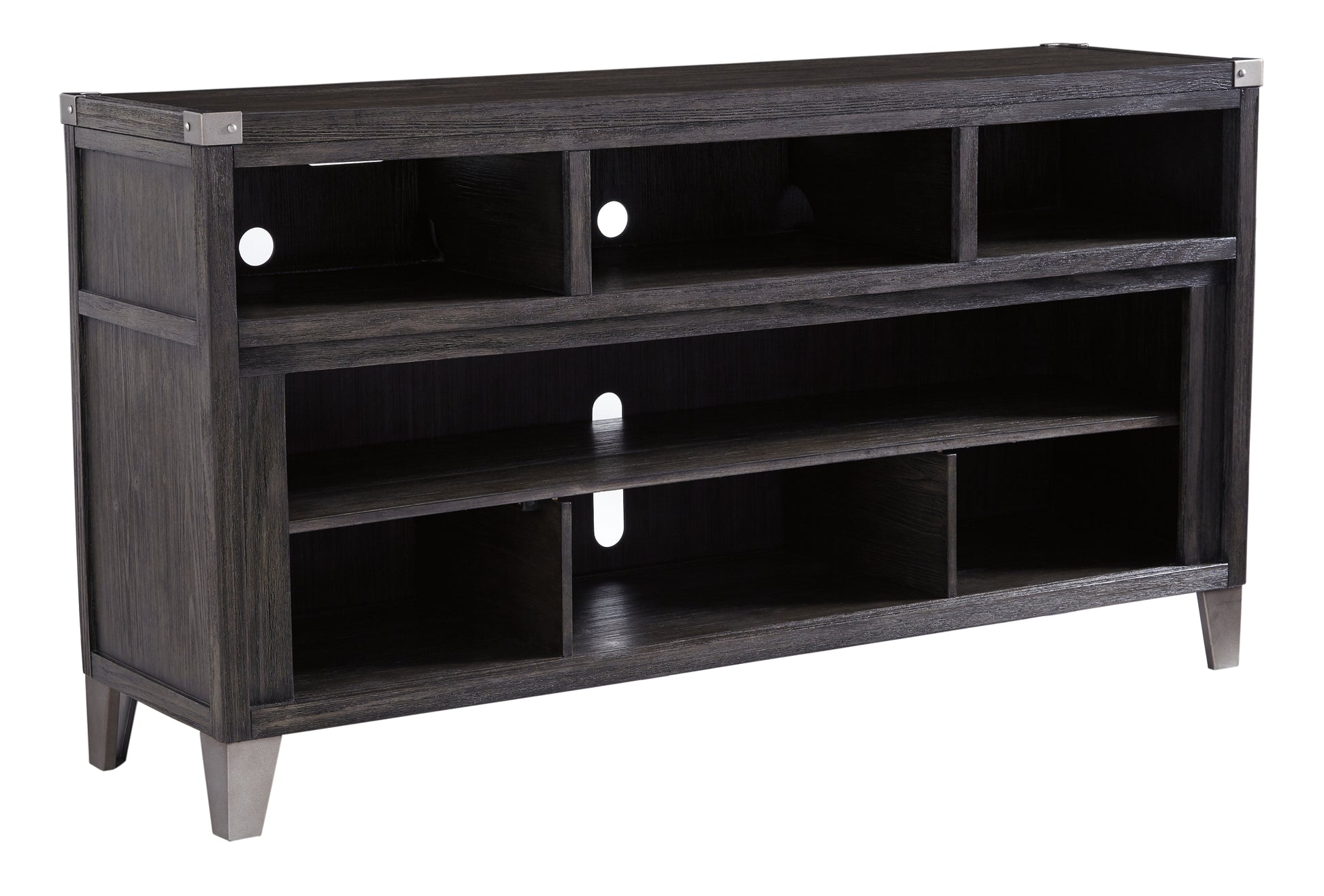 Make watching TV a joy. This TV stand's rustic-industrial style—with a gray finish, squared edges, zinc-tone corner bracket accents and nailhead detailing—is sure to complement any contemporary decor. Several vented open cubbies offer impressive shelf space, convenient for keeping all of your electronic gear within reach. Handy cutouts keep cords out of sight. The stand's large center opening accommodates a shelving insert (included) or an optional fireplace insert (sold separately).